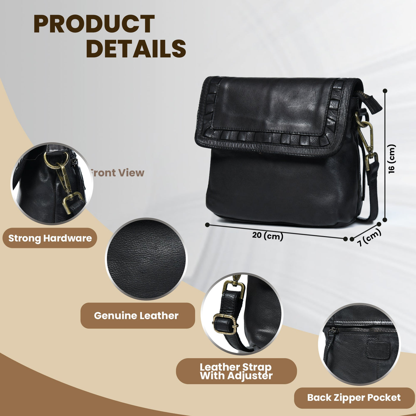 Adjustable leather strap for crossbody or shoulder wear.