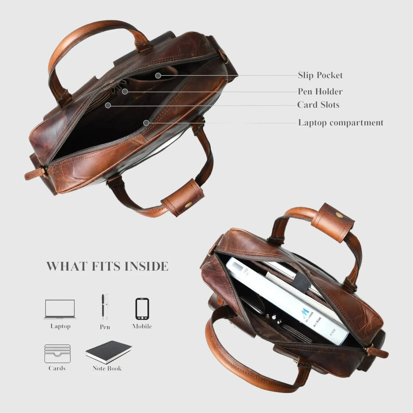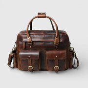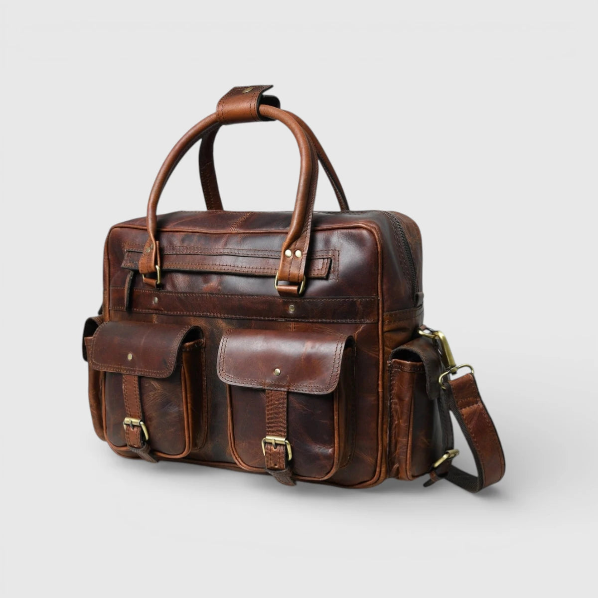 The exterior features dual buckle-flap front pockets and additional side compartments — ideal for chargers, cables, diaries, and everyday accessories. Antique brass fittings enhance its rugged character, while reinforced leather handles and a detachable shoulder strap provide multiple carrying options for work, travel, or meetings on the go.