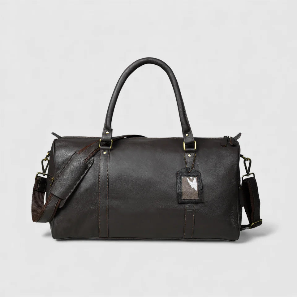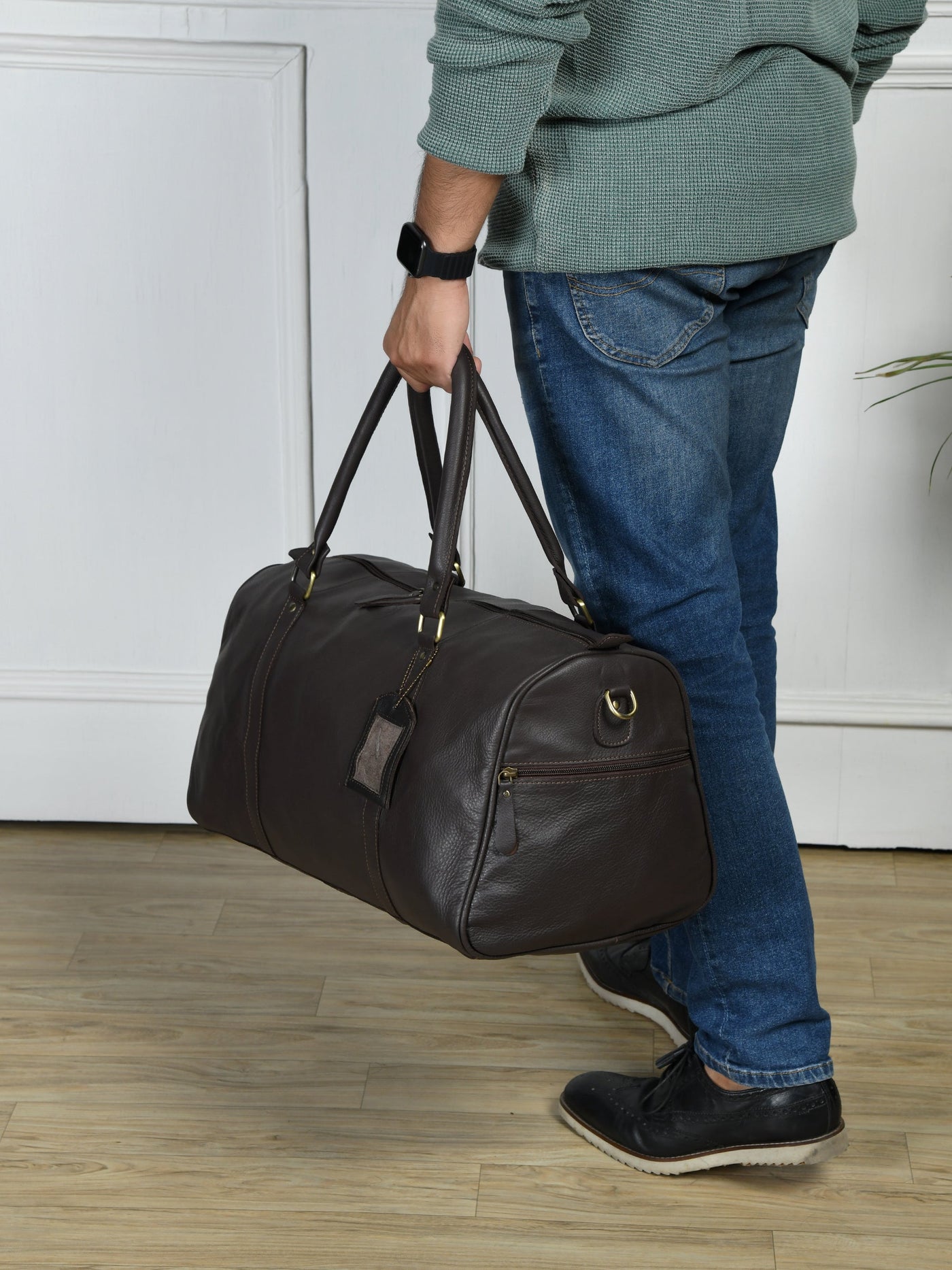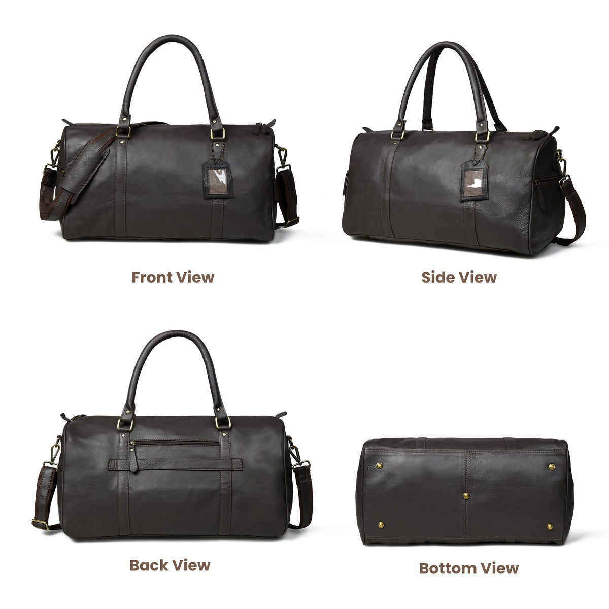 Designed for discerning travelers who cherish both elegance and functionality, The Voyager Leather Travel Duffel radiates timeless sophistication. Crafted meticulously from superior full-grain buffalo leather, this duffel bag features a rich dark-brown finish complemented by vintage-inspired antique brass hardware. Spacious yet sleek, it accommodates your essentials seamlessly for short business trips, weekend getaways, or spontaneous adventures. Thoughtfully placed pockets and compartments enhance convenience, keeping your belongings easily accessible and organized. Reinforced handles and an adjustable, padded shoulder strap guarantee comfort during transit, while sturdy base studs ensure enhanced durability and a distinguished appearance.