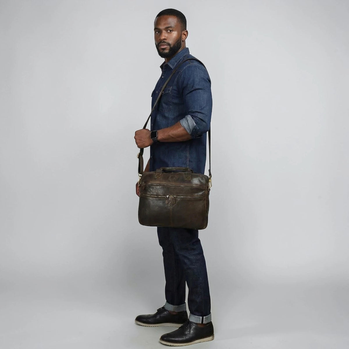 The Voyager Vintage Leather Laptop Bag combines classic elegance with modern practicality, ideal for professionals, academics, and style-savvy travelers. Meticulously crafted from premium full-grain buffalo leather, this rich, dark chocolate-colored bag is built to endure daily use while acquiring a distinct patina over time, reflecting your personal journey.